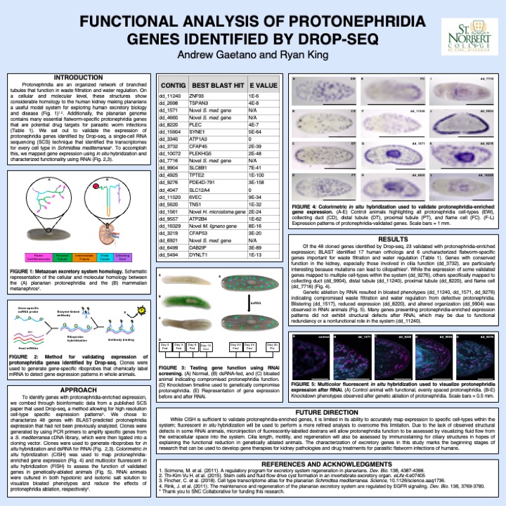 Schmidtea mediterranea, the freshwater planarian, possesses protonephridia, which are an organized network of branched tubules that function in waste filtration and water regulation. On a cellular and molecular level, these structures show considerable homology to the human kidney making planarians a useful model system for exploring human excretory biology and disease (Scimone, 2011 and Vu, 2015). Additionally, the planarian genome contains many flatworm-specific protonephridia genes essential for survival, making them potential drug targets for parasitic worm infections of humans. We set out to validate the expression of protonephridia genes identified by Drop-seq, a single-cell RNA sequencing technique that identified the transcriptomes for every cell type in S. mediterranea (Fincher et al., 2018). To accomplish this, we mapped gene expression using colorimetric and fluorescence in situ hybridization and characterized gene functionality via RNA interference screening (RNAi).