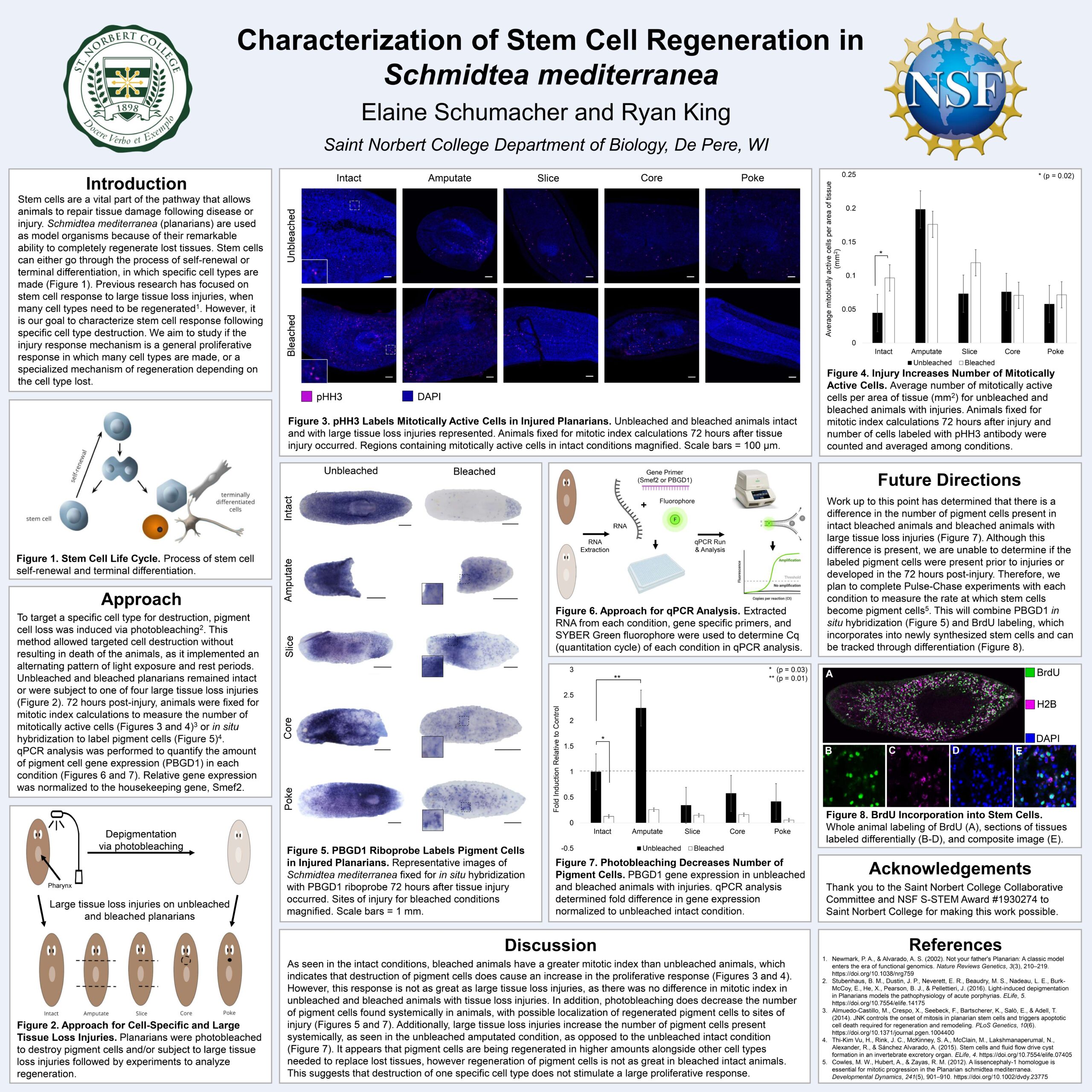 Animals rely on stem cells to repair tissue damage following disease or injury. In order to study stem cells, Schmidtea mediterranea (planaria) is used as a model organism because of their unique ability to completely regenerate lost tissues through the use of stem cells. Previous studies have focused on how stem cells proliferate in response to injuries with large tissue losses where many cell types need to be regenerated at once. However, in the case of many human injuries or diseases, only one specific cell type is lost. This project aims to characterize how stem cells respond following destruction of specific cell types, particularly if the injury response mechanism is a general proliferative response or a specialized mechanism depending on the cell type lost. Work up to this point has allowed for destruction of pigment cells via light-induced pigment cell loss. Doing so has allowed measurement of proliferation of stem cells following injury through mitotic index calculations and measurement of pigment cells present following injury through in situ hybridization and qPCR. Current works aim to measure the rate at which stem cells and pigment cells regenerate following injury through BrdU Pulse-Chase experiments. Continued research will give insight about the molecular mechanisms behind regeneration following injury or disease involving specific cell types.
