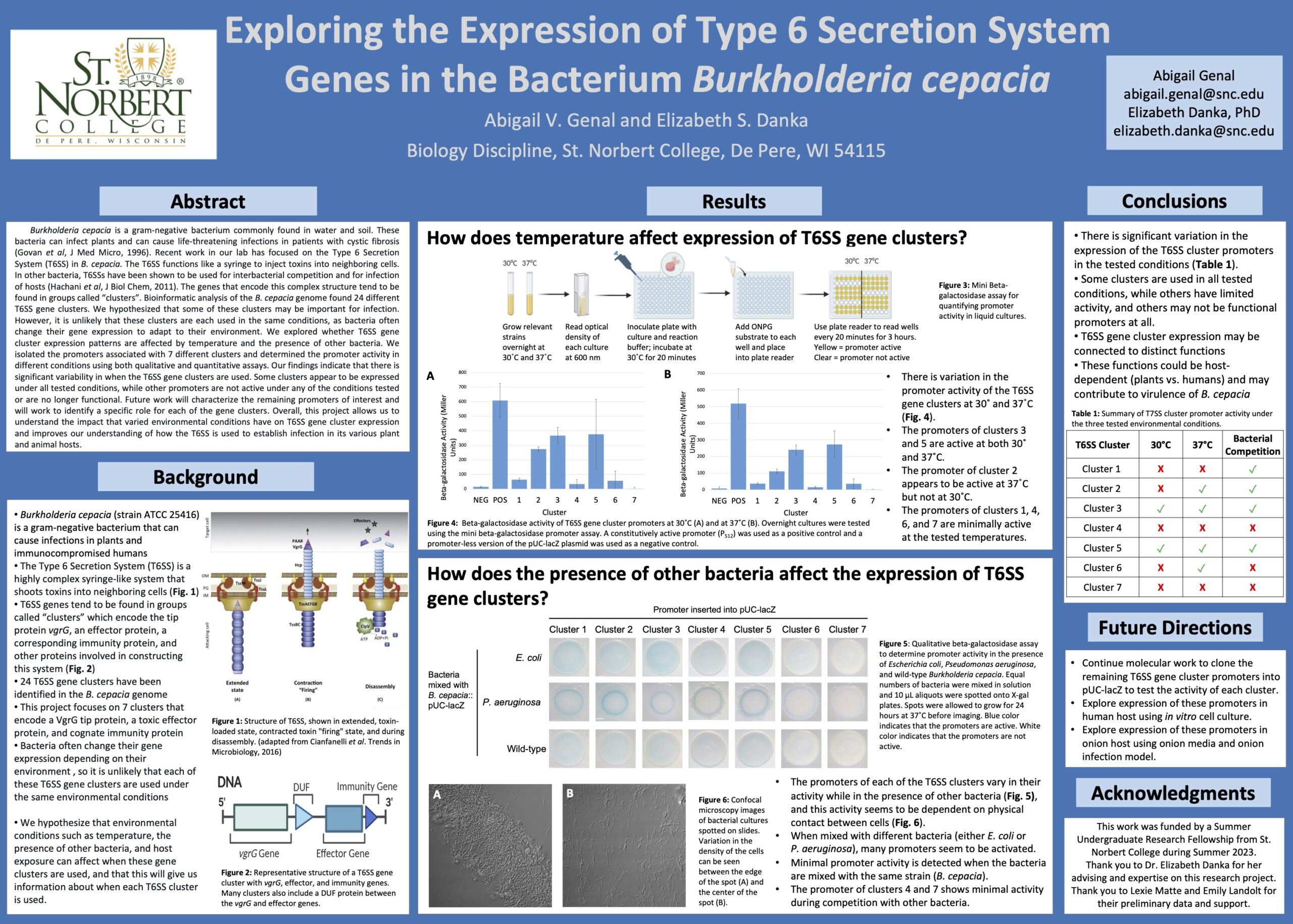 Burkholderia cepacia is a bacterium that can infect plants and immunocompromised humans . Recent work in our lab has focused on the Type 6 Secretion System (T6SS) in B. cepacia. The T6SS functions like a syringe to inject toxins into neighboring bacterial or eukaryotic cells. The genes that encode this complex structure tend to be found in groups called “clusters.” Bioinformatic analysis of the B. cepacia genome found 24 different T6SS gene clusters. We hypothesized that some of these clusters may be important for infection in plants or animals. However, it is unlikely that these clusters are each used in the same environmental conditions. We explored whether T6SS gene cluster expression patterns are affected by temperature, the presence of other bacteria, and components and molecules derived from onions. We isolated the promoters associated with 7 different clusters and determined the promoter activity in different conditions using both qualitative and quantitative assays. Our findings indicate that there is significant variability in when the T6SS gene clusters are used. Some clusters appear to be expressed under all tested conditions, while other promoters are not active under any of the conditions tested or are no longer functional. Future work will characterize the remaining promoters of interest and will identify a specific role for each of the gene clusters. Overall, this project allows us to understand the impact that environmental conditions have on T6SS gene cluster expression and identifies T6SS-mediated mechanisms required for infection in plants and animals.
